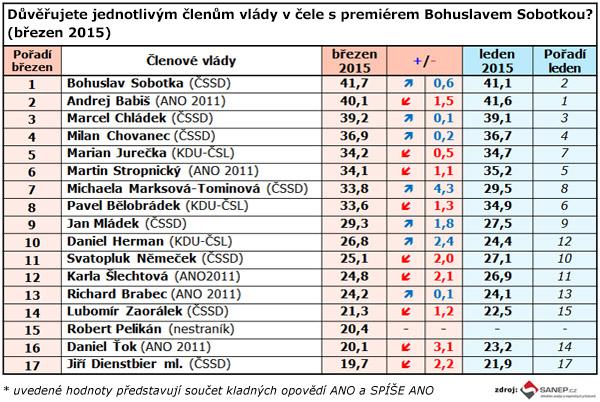 Jak ukázal aktuální exkluzivní průzkum společnosti SANEP, který se zabývá pravidelným hodnocením důvěryhodnosti ministrů koaliční vlády premiéra Bohuslava Sobotky, po více jak roce činnosti vládního kabinetu se největší důvěře se ziskem 41,7% kladných hlasů těší samotný premiér Bohuslav Sobotka, který tak poprvé sesadil z prvního místa dosud nejlépe hodnoceného ministra financí a šéfa hnutí ANO 2011 Andreje Babiše. Ten se tak stává se ziskem 40,1% kladných hlasů druhým nejlépe hodnoceným členem vládního kabinetu.
